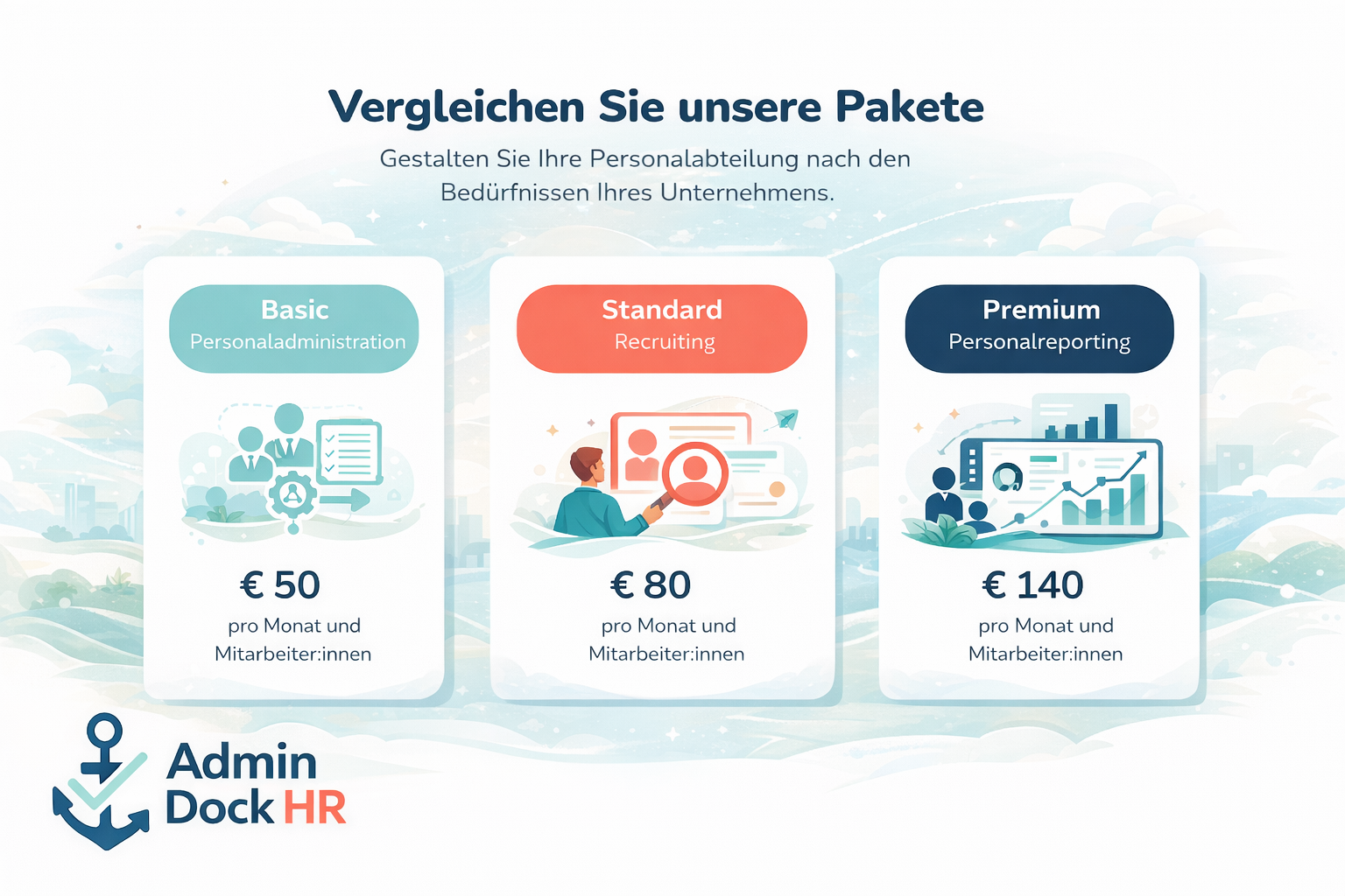 Ob Sie mit einer kleinen Lösung starten oder umfassend entlastet werden möchten – unsere HR Pakete sind flexibel kombinierbar. Die folgenden Konditionen zeigen, wie unsere Zusammenarbeit strukturiert ist: fair, transparent und auf langfristige Partnerschaft ausgelegt.